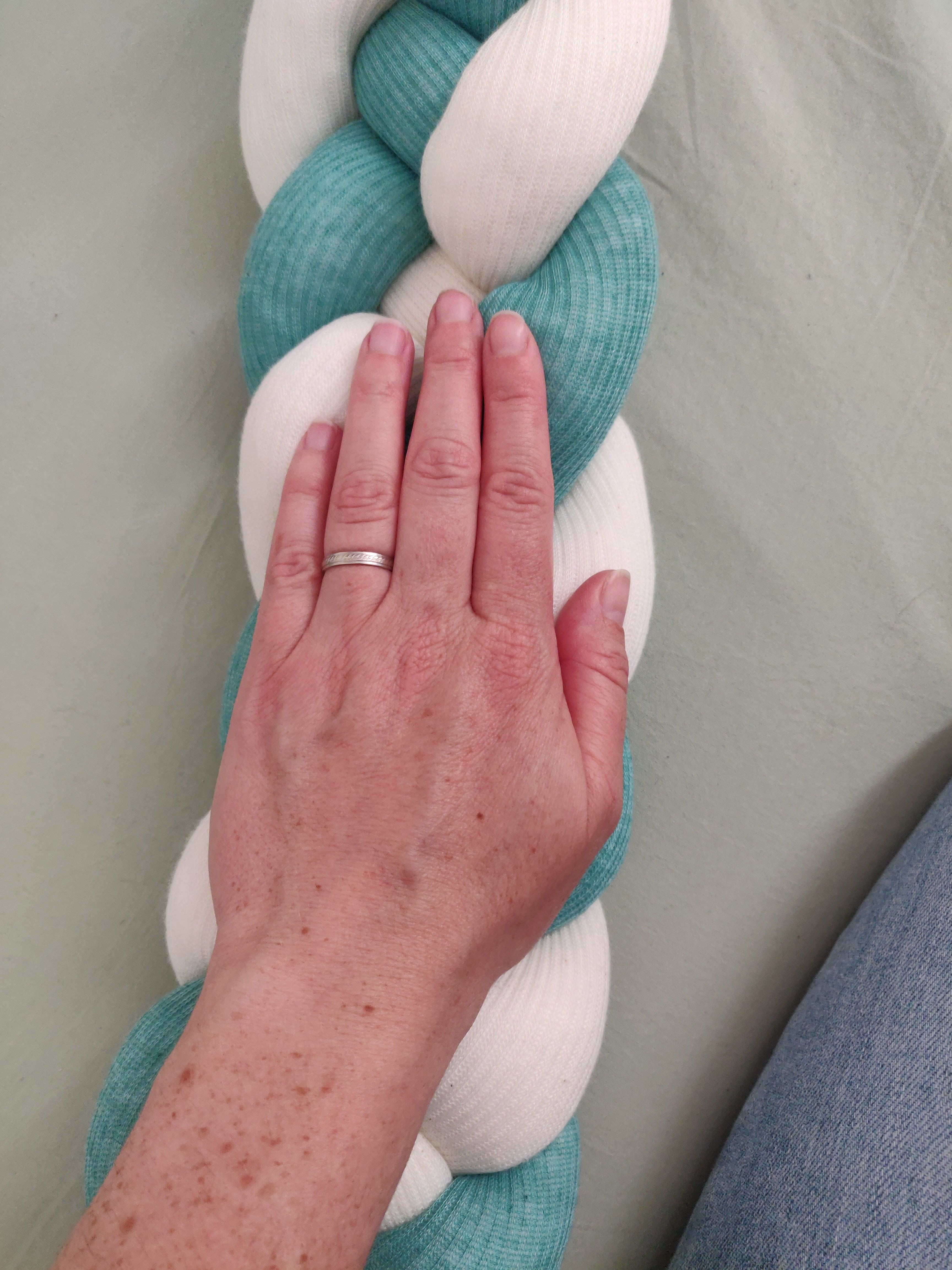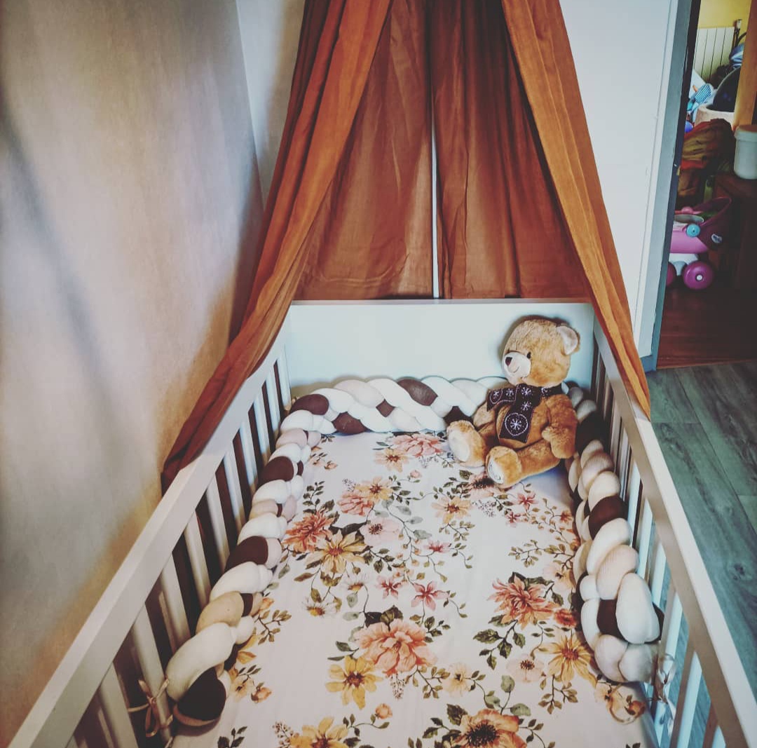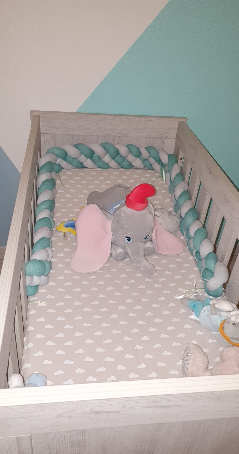 Première tresse (moitié de lit) commandée il y a 2 ans chez @lpa&c et une autre (tour de lit entier) commandée 1 an après et elles n'ont pas bougées. Notre puce de 2 ans, qui bouge beaucoup la nuit, en a une depuis sa naissance et ça lui évite de se cogner ou de se coincer les pieds. Elles sont de très bonne qualité, hyper respirantes et personnalisables ! Nous avions aussi pris la petite boule avec hochet de dentition.